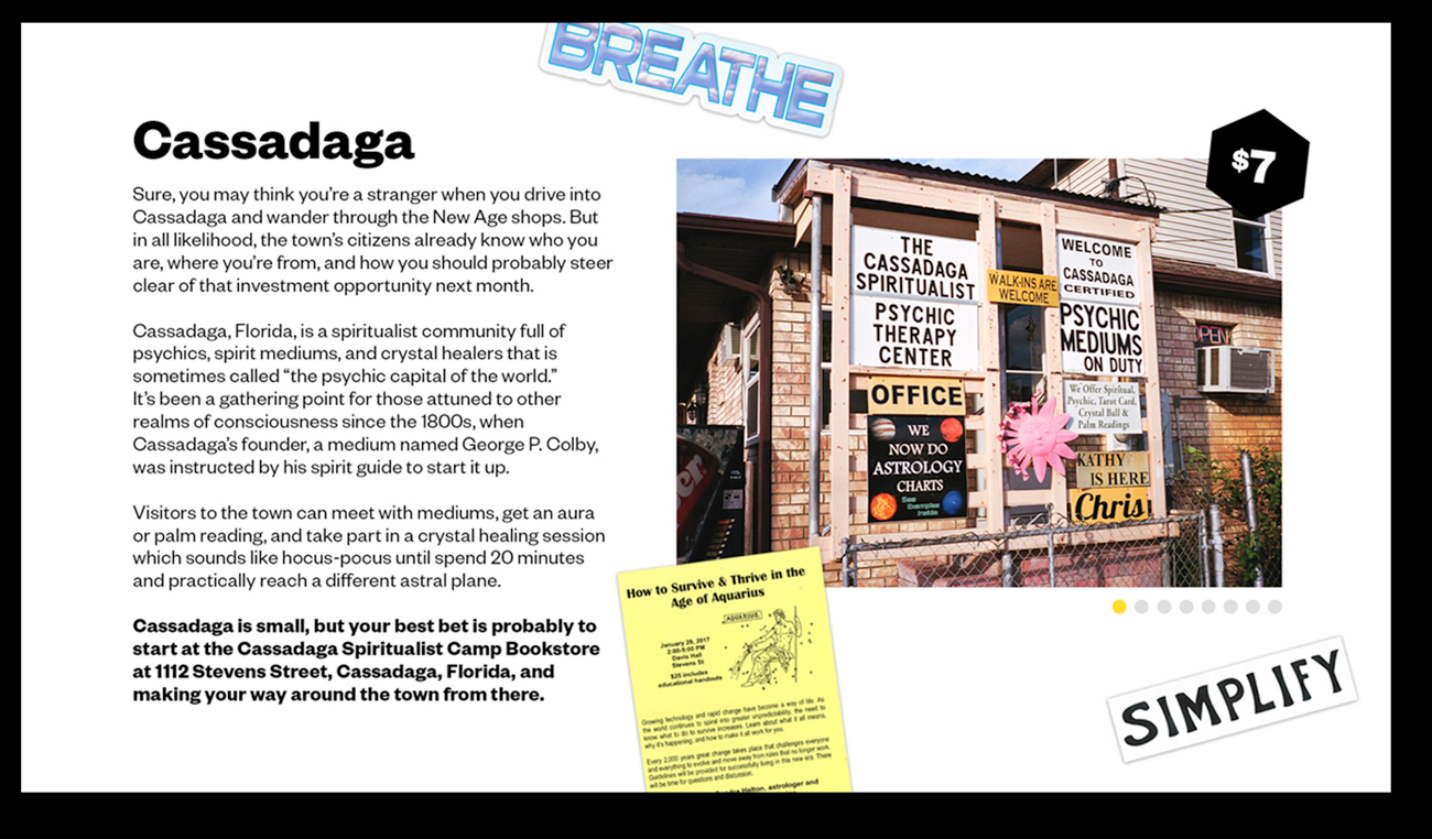 Go America - A once in a lifetime project where Geico and VICE sent a small team around the United States to create a travel guide that explores some of the more eccentric road trip options. We stopped across strange and beautiful sights, attractions and met some wonderful characters along the way. My role was to form the general art direction, layout the websites and create illustrations. It was a massive pleasure working closely with our photographer Julian Master.